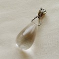 まさにその伝説を髣髴させる、美しき白ターラを生み出した観音様の慈悲の涙のようなのです。 限りなく透明な涙ですが、内部には霧状のもやや層もほとんど見られません。 しかしとろっとした甘みや程よい照りがあり、ガネーシュヒマール産らしい雰囲気を持っております。 なかなか大きめな涙型ですので、存在感も抜群です。 シンプルながらもお洒落に仕上げた銀細工も自信作です。 このデザインであれば、男性・女性共に格好良く着けこなせるのではないでしょうか。 それにしてもピントが合い難く、写真が撮りづらかったです。