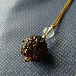 ヒマラヤ水晶透明玉との組み合わせが基本の「き」の字ですね。 どれか迷ったらこれにしておけば間違いないです。 ルドラクチャも丸みを帯びて可愛らしく、凸部分は赤黒く鈍い光沢を放っております。 紐を縦に通したデザインでスタイリッシュですね。 カーキの紐色はお洒落に見えます。