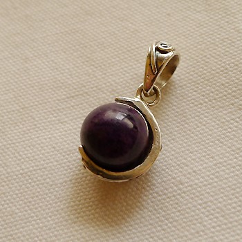 紫色とあずき色、それに黒色を足して3で割ったような色合い、それがスギライトの一般的で理想的な色合いのバランスです。 まさにその配合バランスを地でいったような色合いではありませんか。 こちらは005番と同じ連から来ている玉ですが、005番に比べると色の境界線が明瞭です。 それにより地層のような神秘的な模様が見られるのが特徴的。 これ実は11mmのスギライト玉を上手く生かしてペンダントにしたデザインなのです。 ブレスレットを作る際は一玉ではどうしようもありませんが、これならば一玉で即戦力のペンダントなのです! ということで考案したデザインです。 丸玉は回りますので、お好きなところを正面に向けてご着用ください。 三日月のように先端が細くなると共に、フィルグリ(ワイヤー細工)によりデザインも付けております。 これがスパイキーのペンダント作りの真骨頂です。
